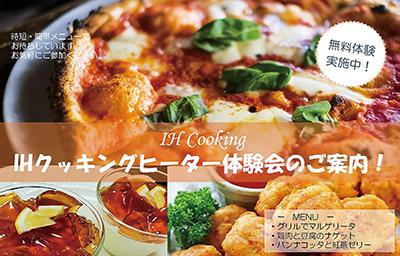 ●参加費:無料●持ち物/エプロン・お手拭き●メニュー/IHグリルでマルゲリータ・鶏肉と豆腐のナゲット・パンナコッタと紅茶ゼリー●開催日3日前まで電話にてお申し込み下さい ※9:00〜17:00(平日のみ)●IHに興味がある!導入したい!便利な使い方を知りたい!調理をしながらIHの便利な機能や使い方、お手入れポイントなどわかりやすくお伝えします。お気軽にご参加下さい♪作った料理はお持ち帰りいただけます。