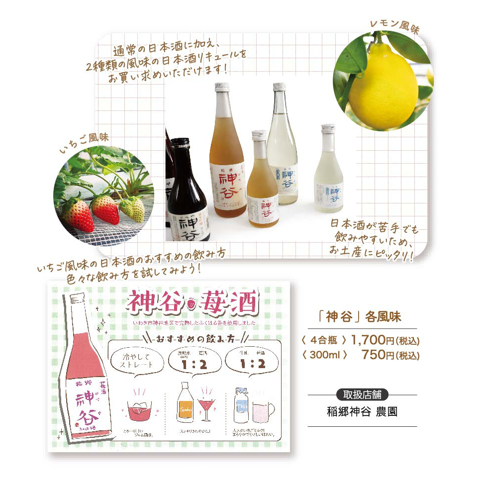 農事組合法人稲郷神谷では、神谷地区で生産された「天のつぶ」を使用した日本酒「神谷」をベースに、自社で栽培したいちごとレモンを用いた日本酒リキュールを販売しています。