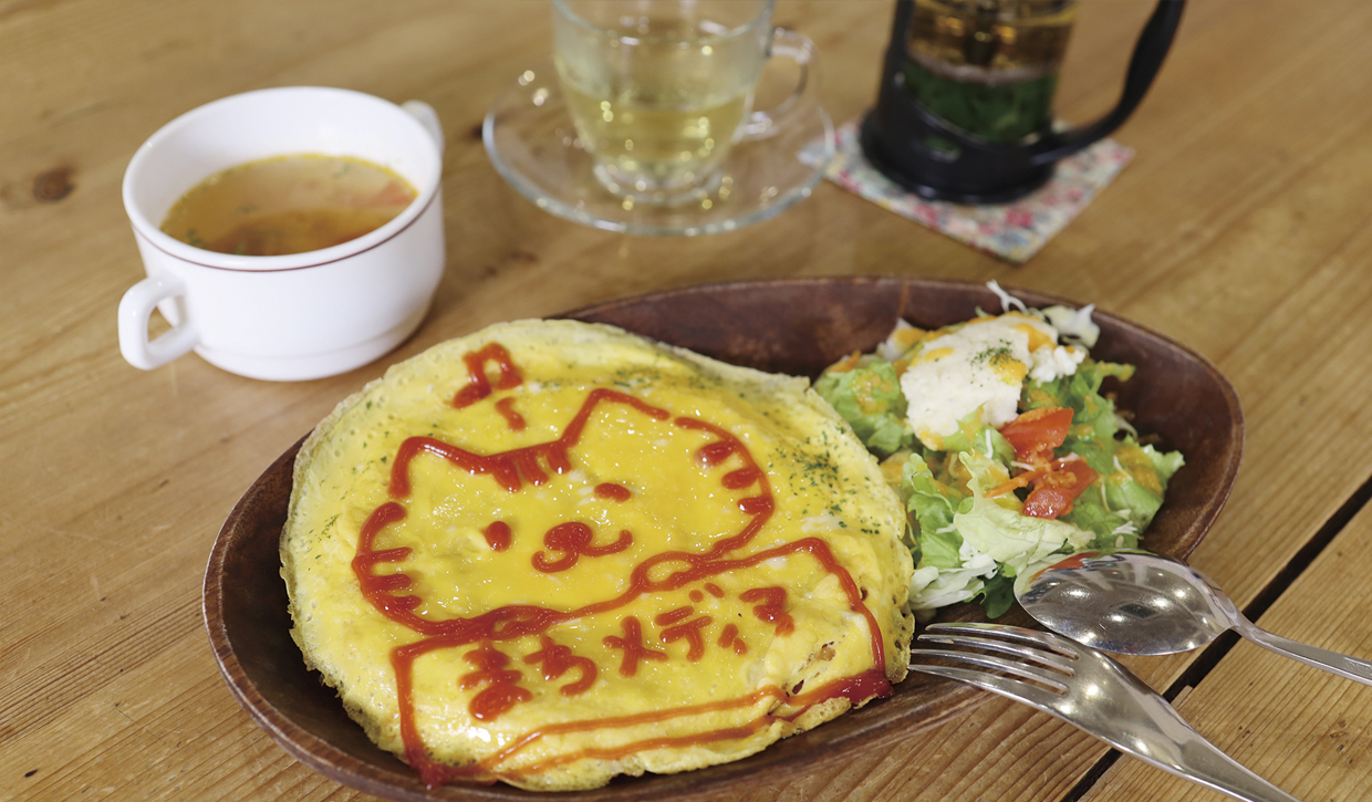 ランチは、メインにサラダとスープ、飲み物が付くセットがお得です。玉ねぎをじっくり炒め、甘みやコクを引き出した自家製ケチャップを使ったオムライスは、一つひとつにキャラクターを描いてくれるケチャップアートが人気。できる範囲でリクエストに応えてくれるとのこと。運ばれてきた瞬間、思わず笑みがこぼれる、サンピノチオの看板メニューです。