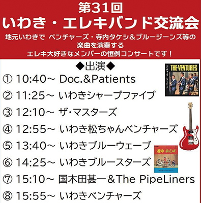 ●スペシャルゲスト/bass:愛川ヒロキ(元マヨネーズ・remote・他)、drums:星山哲也、key:荻野直子、vo.ch:脇沢ヒロユキ(元ジャック&リトルビーンズ)、vo. Ag:くしだけーとく(いわきんぐ)、key:ゆぎ坊(いわきんぐ)、vo:KEIZI(元リフレイン、drums:桑原浩一(元リフレイン)、vo:田中まさし(タナやん)