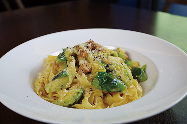 ごろっと存在感のある芽キャベツがたっぷりの春を感じるカルボナーラのレシピです。合わせるのは、弾力のある平打ちのフィットチーネ。濃厚なソースがしっかりと絡んだ、満足感のあるパスタです。仕上げの水分量がポイント!水っぽい時は弱火で温めて調整し、とろりとしたソースを完成させましょう。