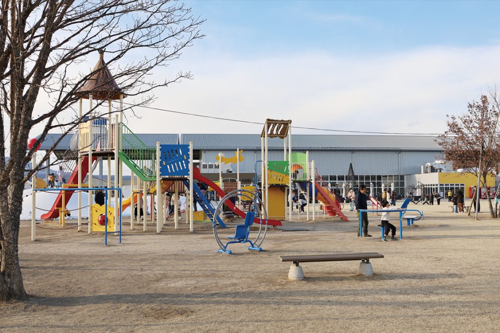 芝生広場には、子供が思いっきり遊べる遊具やふわふわドーム、健康遊具があります。大人も子供も一緒に楽しめる広場。飲食店でテイクアウトした商品をピクニック気分で楽しむのもおすすめ。また小型犬専用と中・大型犬専用の2つのエリアに分かれたドックランも無料開放しています。